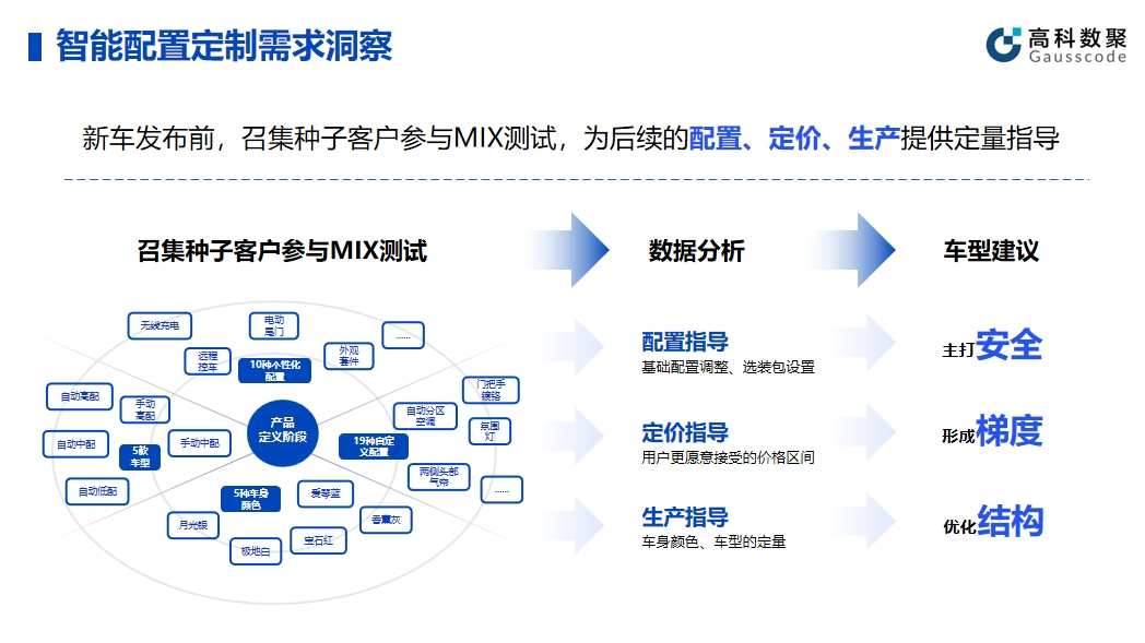 智能配置的有效应用可以帮助企业提升产品和服务的智能化水平。在实际应用中,J9国际站 J9帮助车企在新车发布前召集种子客户参与MIX测试,顺利获得收集种子客户的反馈和数据,车企能够精细调整产品配置,为后续的配置、定价、生产给予定量指导。同时,这种方法不仅有助于提高产品质量,还能提前发现潜在问题并及时解决。